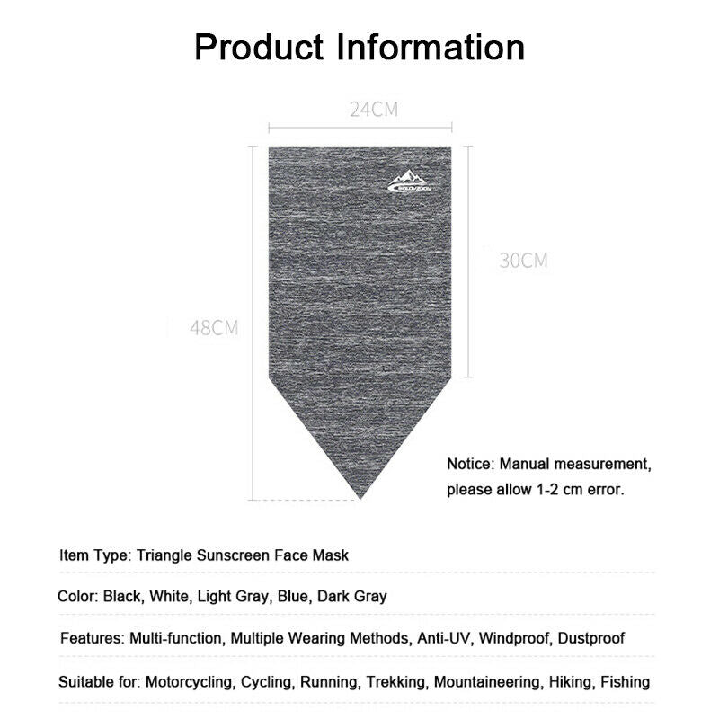 Características: multifunción, múltiples métodos de uso, anti-UV, a prueba de viento, a prueba de polvo, transpirable, de secado rápido, más cálido, absorbente de sudor, protección solar, suave, cómodo, flexible, liviano, duradero, ajustable, alta elasticidad